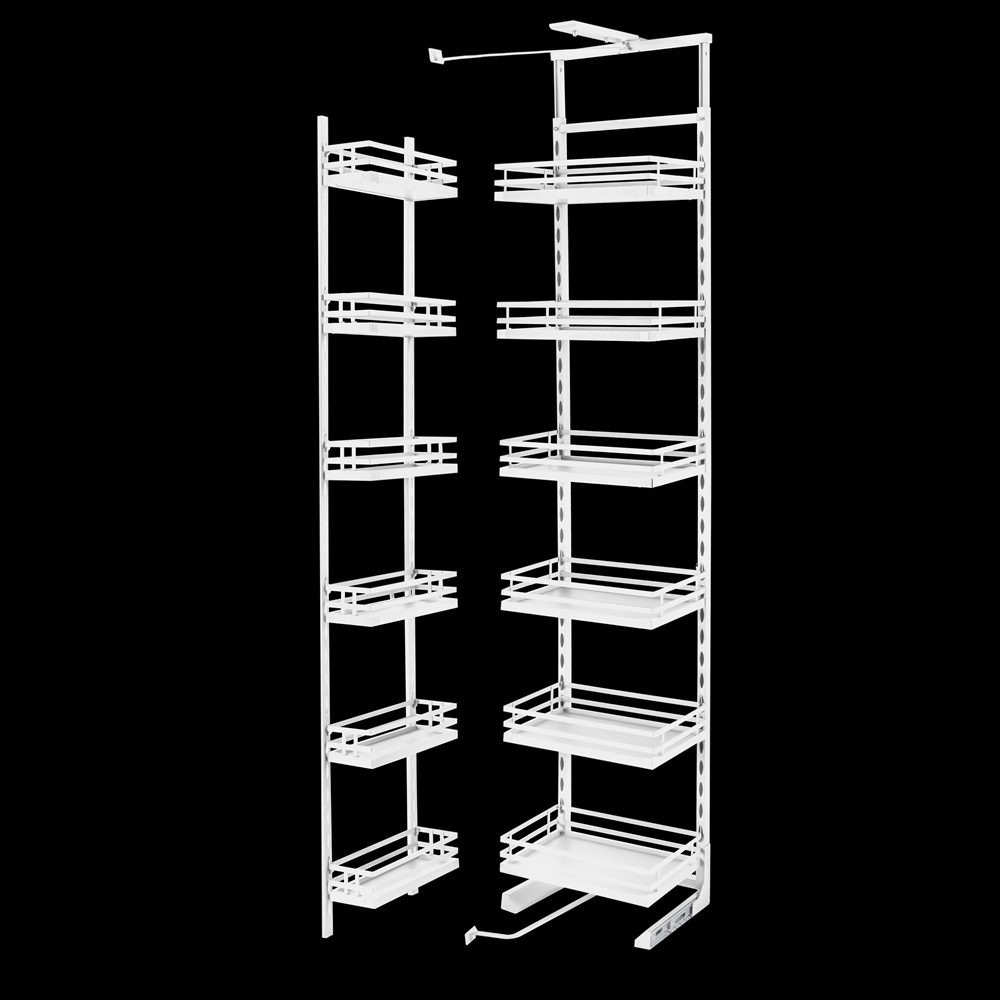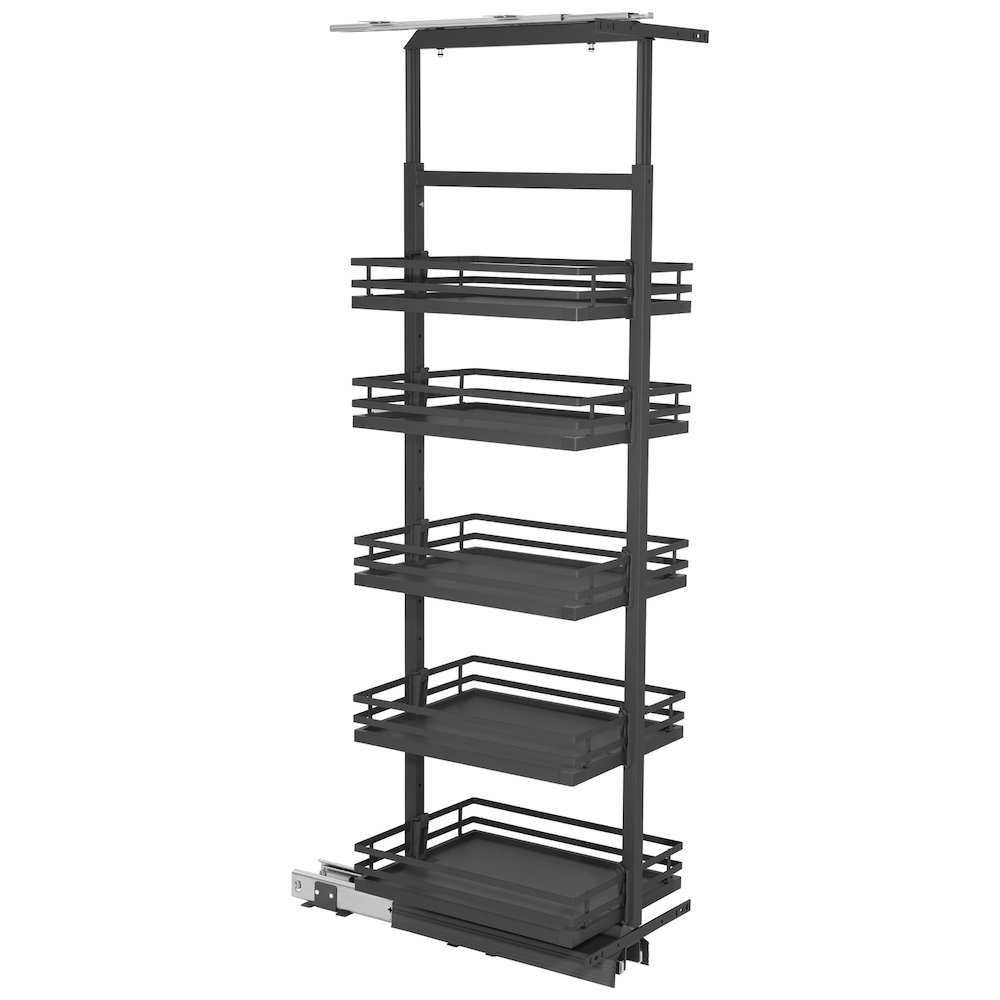 Cargo dostępne są w 2 kolorach (białym i antracytowym) oraz kilku szerokościach i wysokościach, dzięki czemu łatwo je dopasować do zabudowy. Sprawdzają się zwłaszcza w organizacji i przechowywaniu zapasów spożywczych – od makaronów, ryżu i kasz, po przetwory w słoikach, puszki czy butelki. Stabilna konstrukcja pozwala na naprawdę duże obciążenie, a pełne dno – na ustawienie również drobnych produktów. Dwa relingi zabezpieczą wszystkie zapasy przed zsunięciem się i upadkiem podczas otwierania czy zamykania. Regulacja półek umożliwia dopasowanie systemu do specyfiki produktów – wysokich butelek albo niskich puszek, a przez to optymalne wykorzystanie przestrzeni.