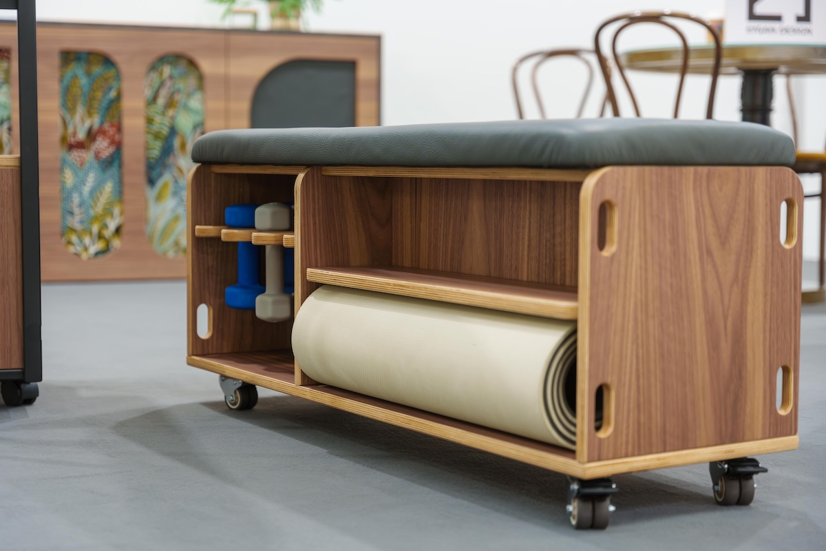 W centrum ekspozycji znajdzie się innowacyjna, wielofunkcyjna komoda, łącząca w jednej formie biurko, domową siłownię i stanowisko do prasowania. Ten projekt pokazuje, jak estetyka, ergonomia i technologia mogą wspólnie odpowiadać na codzienne potrzeby użytkowników. Obok niej zaprezentowane zostaną stoliki nocne oraz szafka RTV z tapicerowanymi frontami – meble, które łączą elegancję i komfort, tworząc spójną całość z nowoczesnymi wnętrzami.