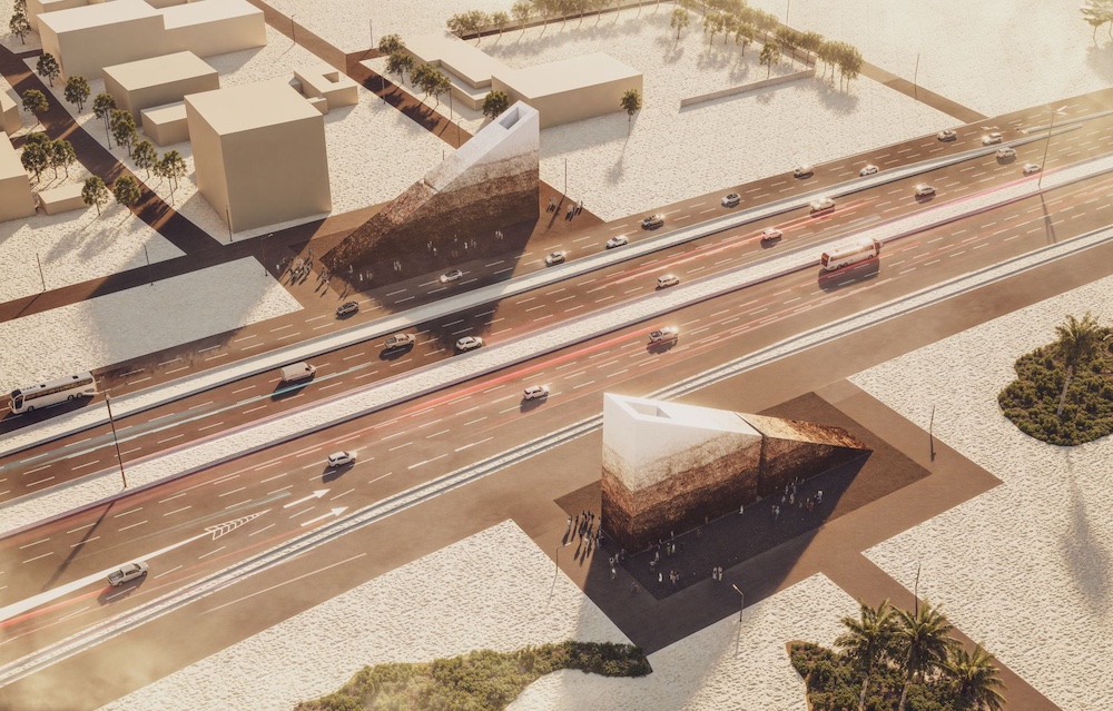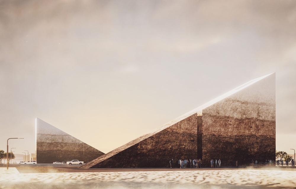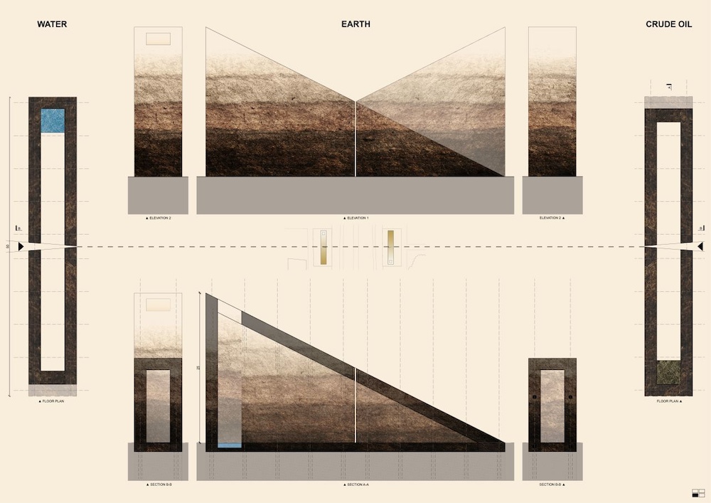 Propozycja Nizio Design International to monumentalna kompozycja dwóch brył z ubitej ziemi, które przypominając skalne masywy, tworzą symboliczną bramę łączącą przeszłość z przyszłością. Architektura rzeźby nawiązuje do geologicznych warstw ziemi, z wyraźnym akcentem na naturalne zasoby, wodę i ropę naftową, od dawna stanowiące fundament gospodarczy Arabii Saudyjskiej. Ściany obu budowli są przecięte szczelinami nawiązującymi do naturalnych pęknięć powstających na powierzchni pustynnych skał. Od strony jezdni szczeliny są węższe, a od strony przeciwnej poszerzają się umożliwiając wejście do wnętrz budowli, na planie wydłużonego prostokąta. Tam, gdzie pochyłe stropy brył osiągają swój najwyższy poziom, umieszczono kwadratowe świetliki. Bezpośrednio pod nimi zaplanowano kwadratowe zbiorniki – pierwszy z nich symbolizuje szyb z ropą naftową, a drugi – studnię z wodą.