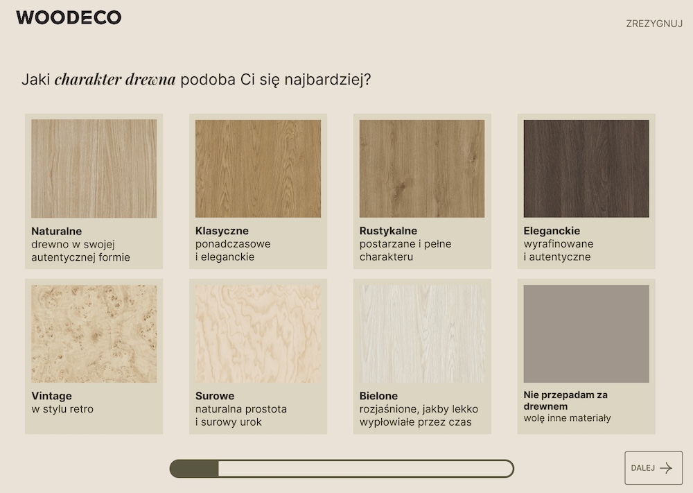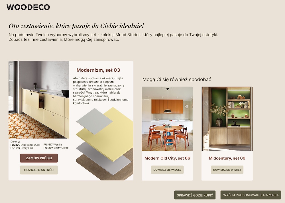 Nie wiesz jaki styl wnętrza będzie idealny dla Ciebie? Gubisz się wśród dużej ilości dekorów i nie wiesz, jak je ze sobą połączyć w aranżacji? Odkryj DecoMate, innowacyjne narzędzie od Woodeco, które pokazuje, że cyfrowa personalizacja może być intuicyjna, inspirująca i skuteczna. Dzięki interaktywnemu quizowi w kilka minut odkryjesz swój styl, otrzymasz dopasowane zestawy dekorów, a próbki będziesz mógł zamówić bez wychodzenia z domu.
