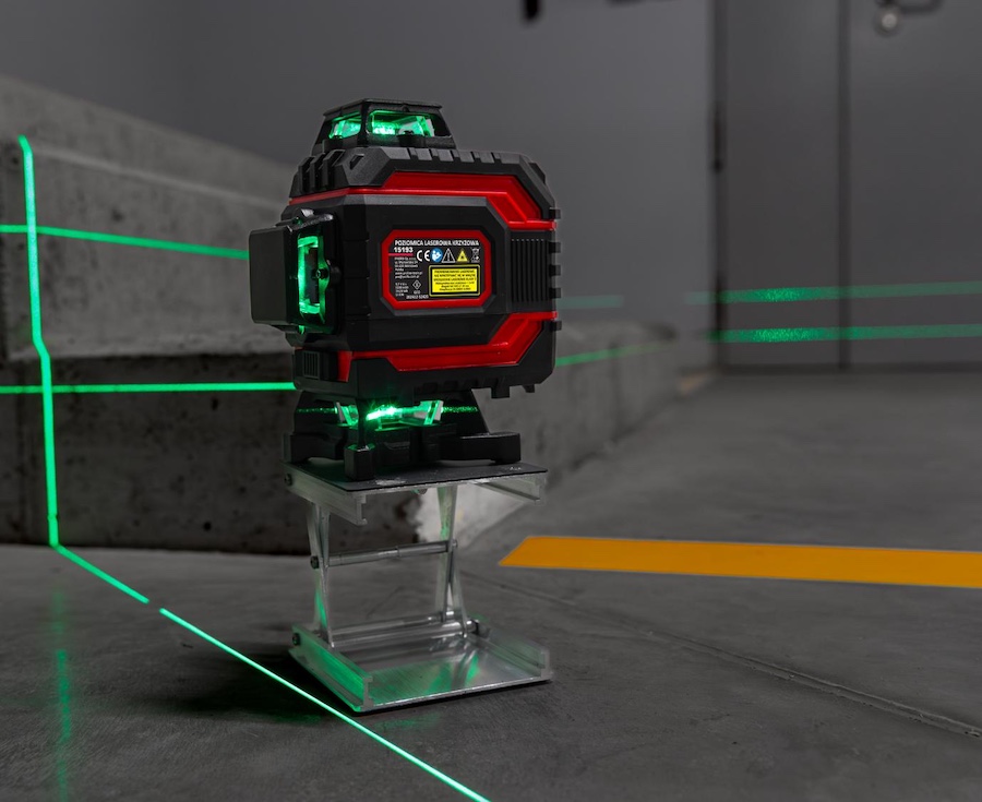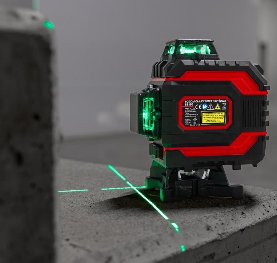 Poziomica laserowa 4D PROLINE 15193 to przenośne urządzenie pomiarowe, które upraszcza i przyspiesza prace budowlane, wykończeniowe i instalatorskie – czyli wszystkie, które wymagają precyzji w wyznaczaniu konkretnych punktów oraz linii konstrukcyjnych i płaszczyzn. Produkt generuje 4 płaszczyzny niwelacji, a zielona wiązka lasera jest 4 razy lepiej widzialna od konwencjonalnego lasera czerwonego. Przykręcany uchwyt umożliwia łatwy i bezpieczny montaż do statywu, a mocny magnes w uchwycie pozwala na montowanie lasera na pionowych profilach metalowych.