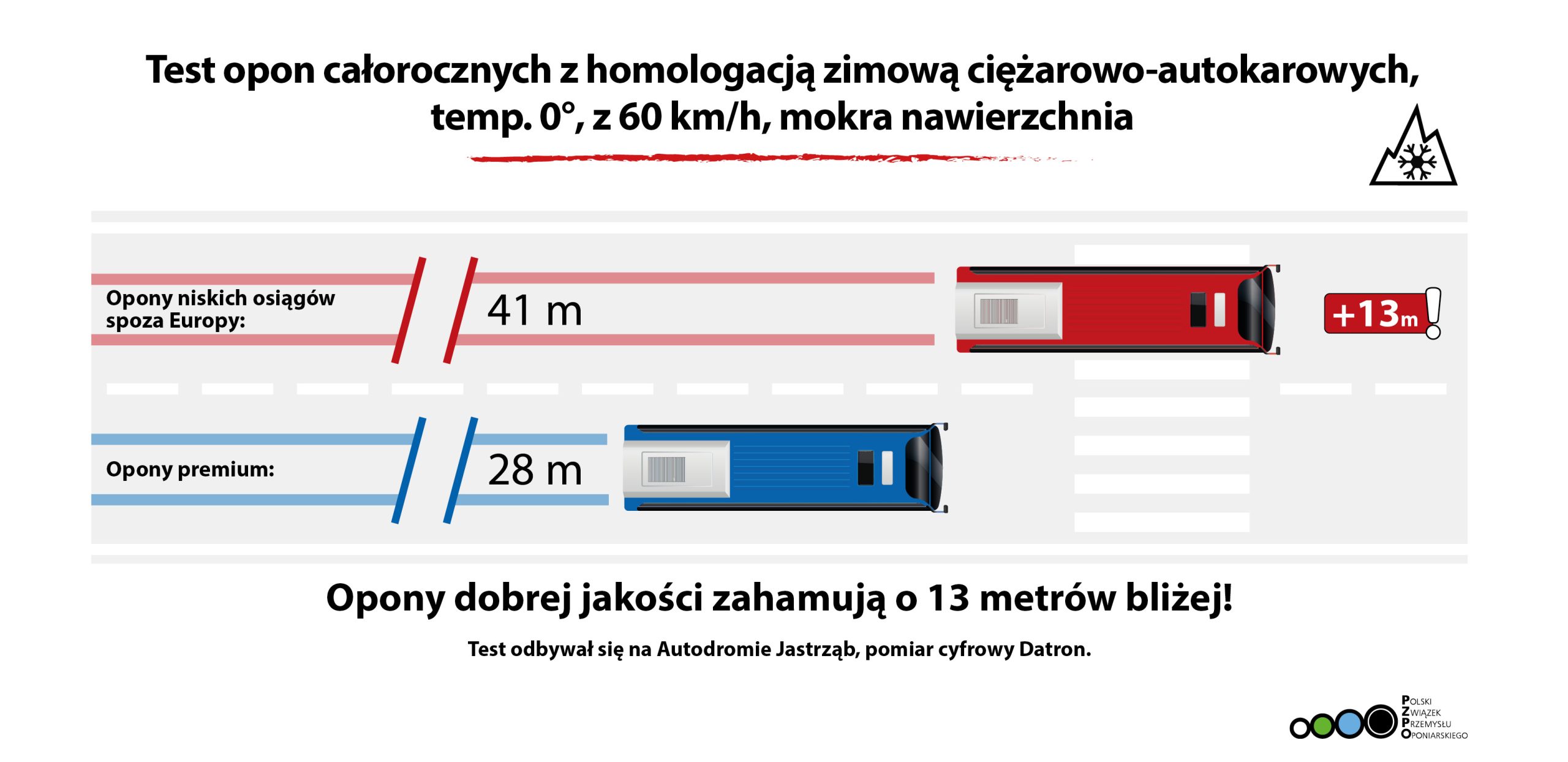 Zazwyczaj mówimy przebiegach opon ciężarowych, ale dziś pokażemy jak ważne jest hamowanie. Budowa i konstrukcja opony jest bardzo ważna – sekret hamowania to nie wzór bieżnika, który można lepiej lub gorzej skopiować, ale mieszanka gumowa z jakiej jest zrobiony. Dlatego testy jednoznacznie pokazują, że opony renomowanych producentów dają znacznie lepsze osiągi niż nieznane produkty spoza Europy. Podobne wyniki otrzymaliśmy w przypadku opon do samochodów osobowych – podkreśla Piotr Sarnecki, dyrektor generalny Polskiego Związku Przemysłu Oponiarskiego (PZPO).